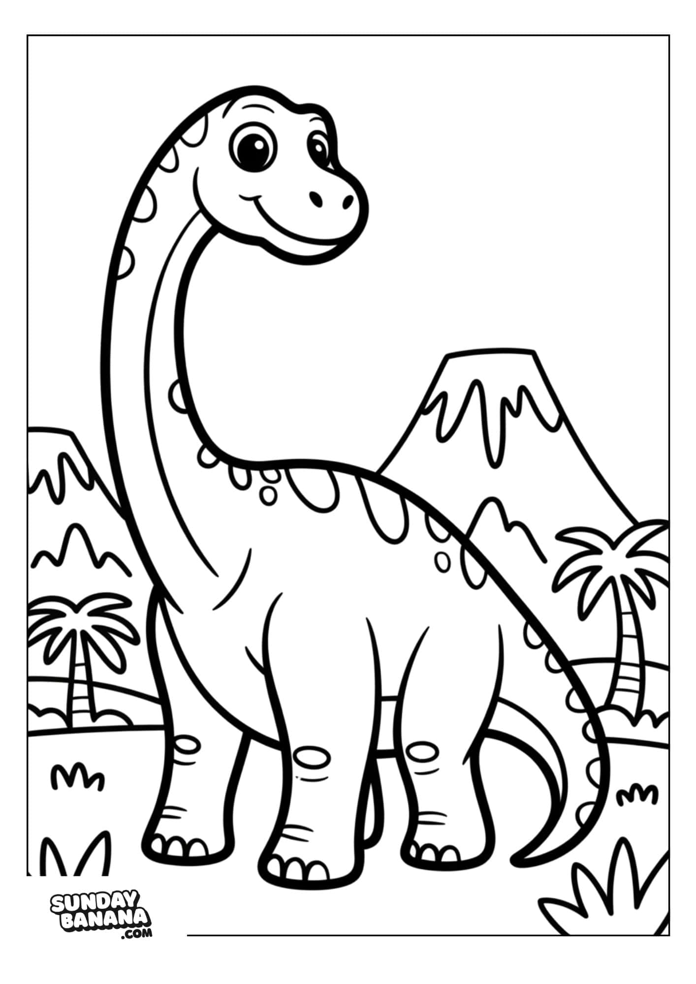 - Color Brachiosaurus Dinosaur pages with volcanic landscape colors for science craft decoration.